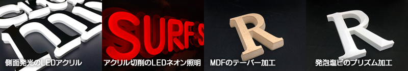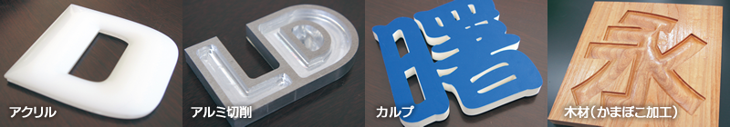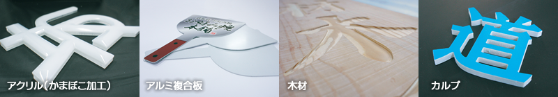 カルプ、アクリル、アルミ複合材、木材コンパネ、各樹脂材など、様々な素材に加工を施すことが可能です。